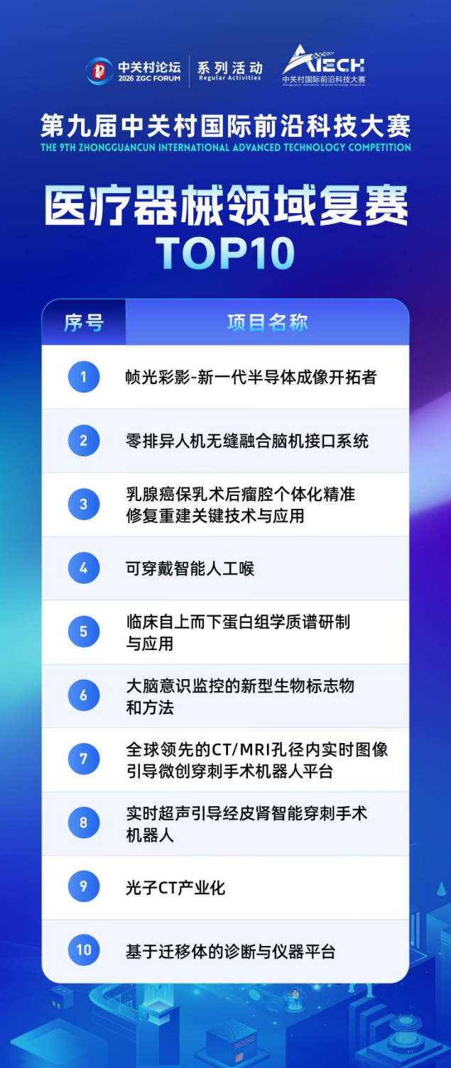 1月20日,2026中关村论坛系列活动——第九届中关村国际前沿科技大赛医疗器械领域复赛在中关村医疗器械园举办,10项创新项目脱颖而出,入围该领域TOP10。
